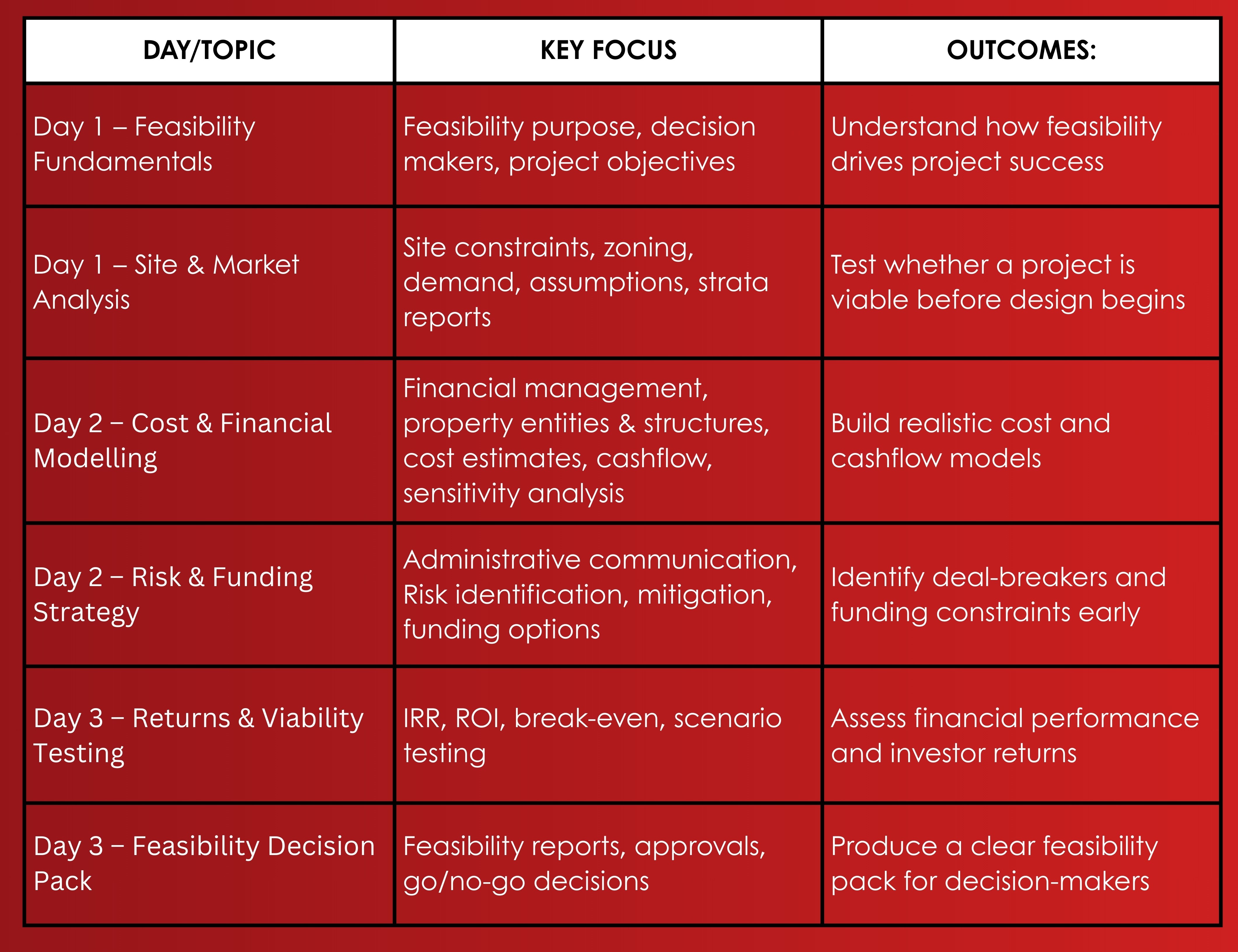Many projects fail long before construction starts, usually due to a lack of a feasibility stage. We’ll give you the shortcut to testing projects before money is spent. From site viability and cost forecasting to risk management, project funding, and return on investment (ROI). You’ll gain practical tools to decide whether a project should proceed, or stop.