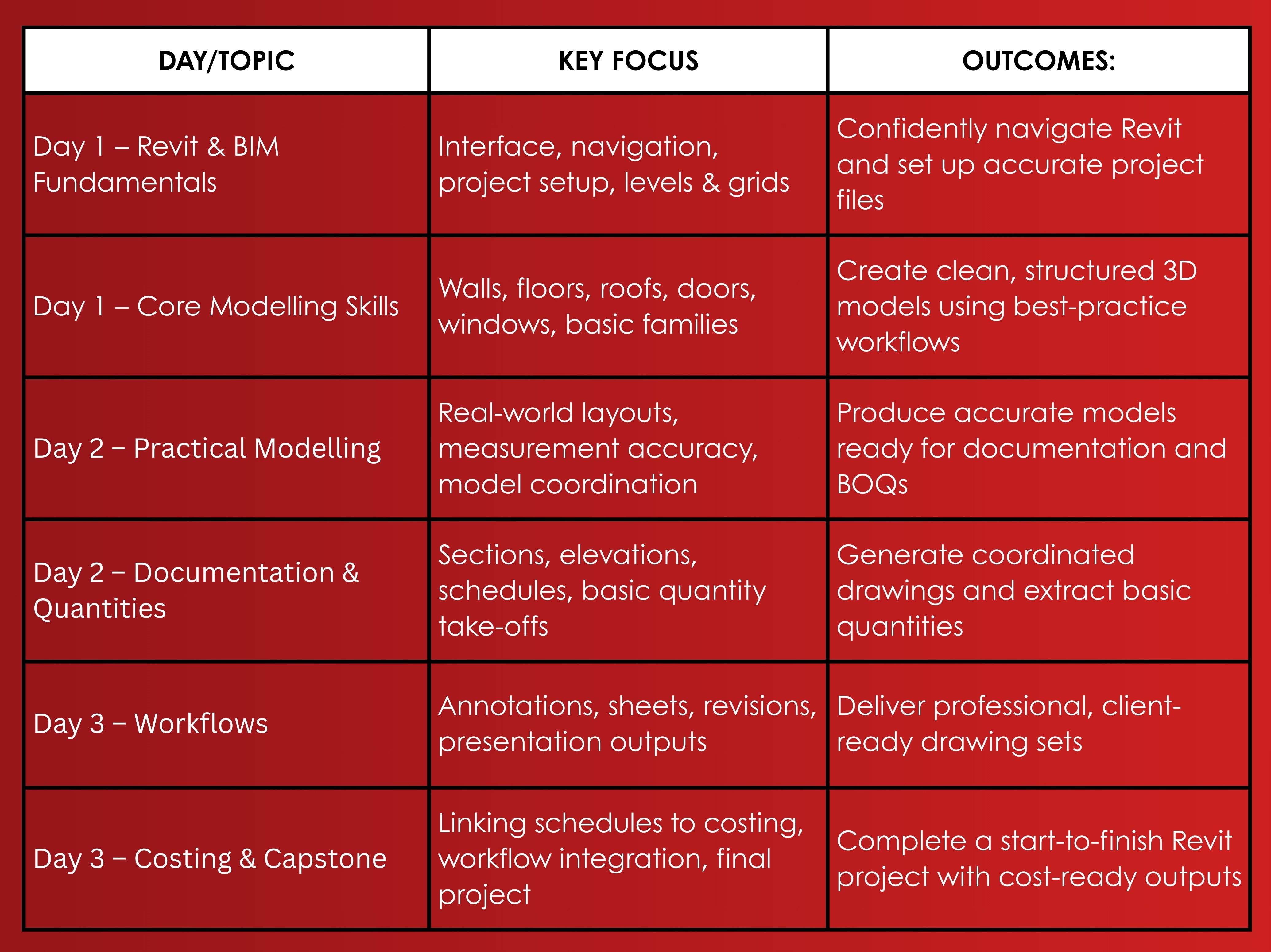 Revit design software is the future of construction, and we’ll give you the shortcuts. You won’t just learn the buttons, you’ll also master workflows that saves you hours. From basic pdf plans, Revit drawings, quick 3D layouts to automated BOQs’. You’ll walk away with a toolkit that turns drawings into contract & construction-ready outputs.